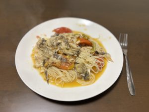 実は岩ガキを剥くのは人生初挑戦の私。YouTubeで説明動画を見ながら苦労してやっと牡蠣6個分を剥くことができました。剥いた牡蠣とムール貝は料理酒で蒸した後にトマト、真鯛の身、ニンニク、オリーブオイルと和えた上でペペロンチーノにしてみました。