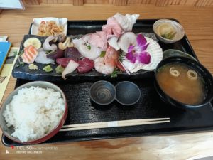 このまま歩いて進んだんですが, 上り坂が急になってきたのとマップで位置を確認できないので途中で引き返しました。回りは誰もいないとても静かな下り道でした。そのまま港の方に向かい, ちょっと気になっていた女川魚市場食堂に入ってみました。とてもきれいな新しいお店で, 雰囲気はお寿司屋さんみたいな感じです。今日は, 頑張ってお刺身定食を頼みました。ボリュウムがあり鯨刺身もありでとても満足完食でした。店主さんも気さくな方で, ここのお店は水産関係のボスの常連店みたいです。あと, レアアジフライがお薦めみたいです, 機会があれば自分もトライしてみます, では。