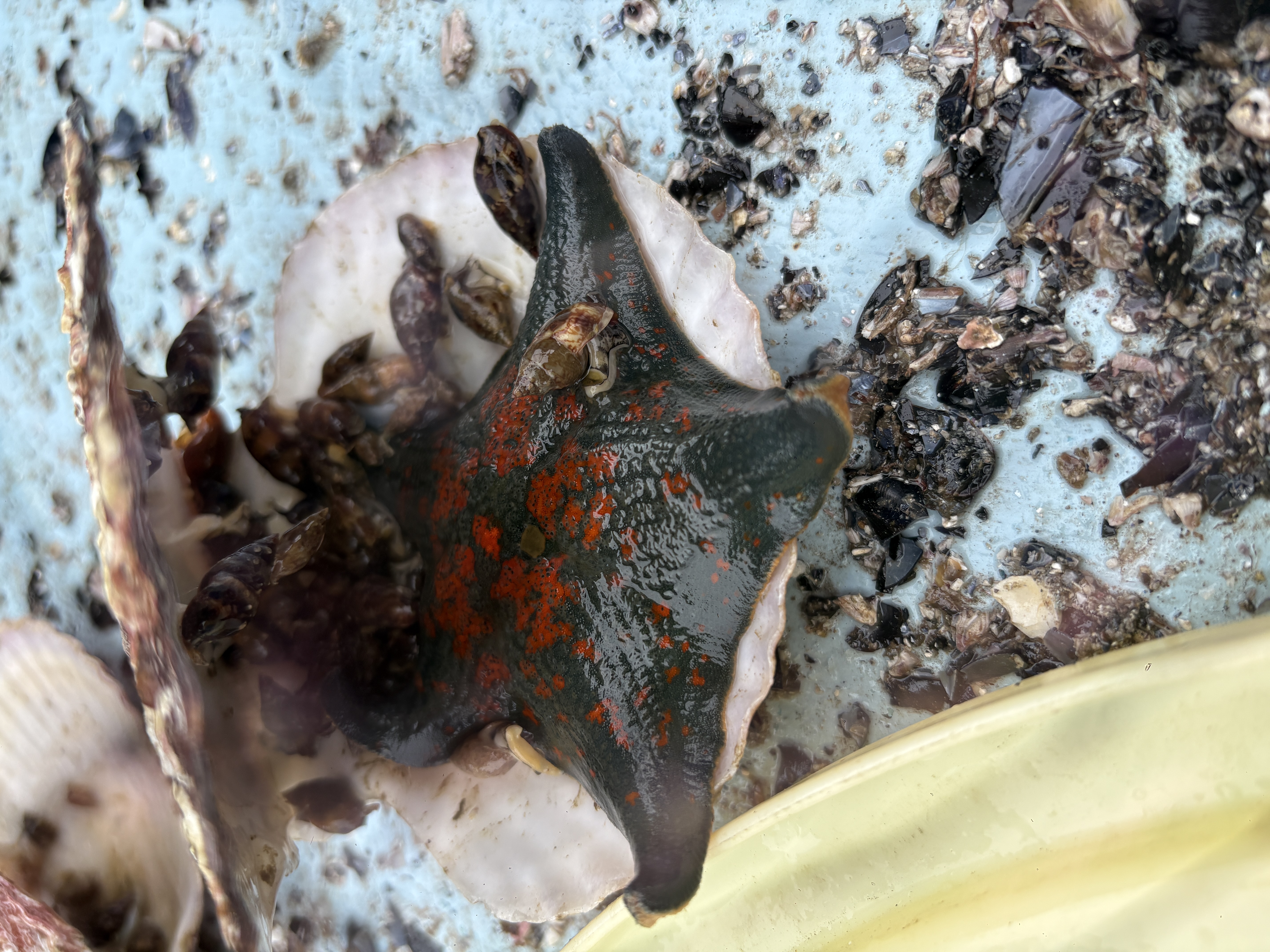 生きているホタテたちは少し高いところに移動させ、捕まえた巻貝は本日の食卓に並びます。これも自然の摂理ということで。美味しくいただきます。