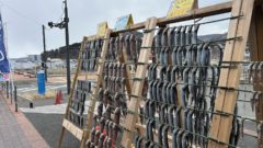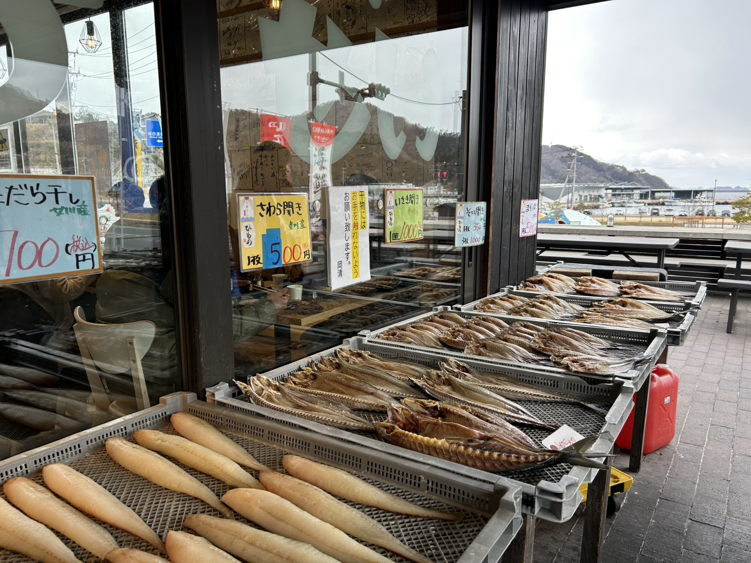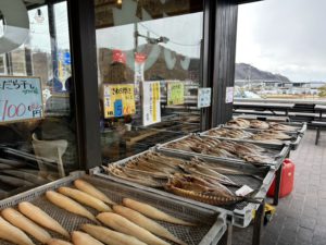 北海道も魚介類が有名とはいえ、札幌は実は海から少し離れていて、特に中心街付近に住んでいると、この光景はかなり貴重です。なんといっても、並んでいるお魚の背景に海と漁船が見えるというのがすごく素敵。