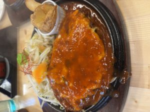 「つきみち」というお店で名物の「つきみちバーグ」を食べた。うまい。トッピングで追加したチーズもうまい。