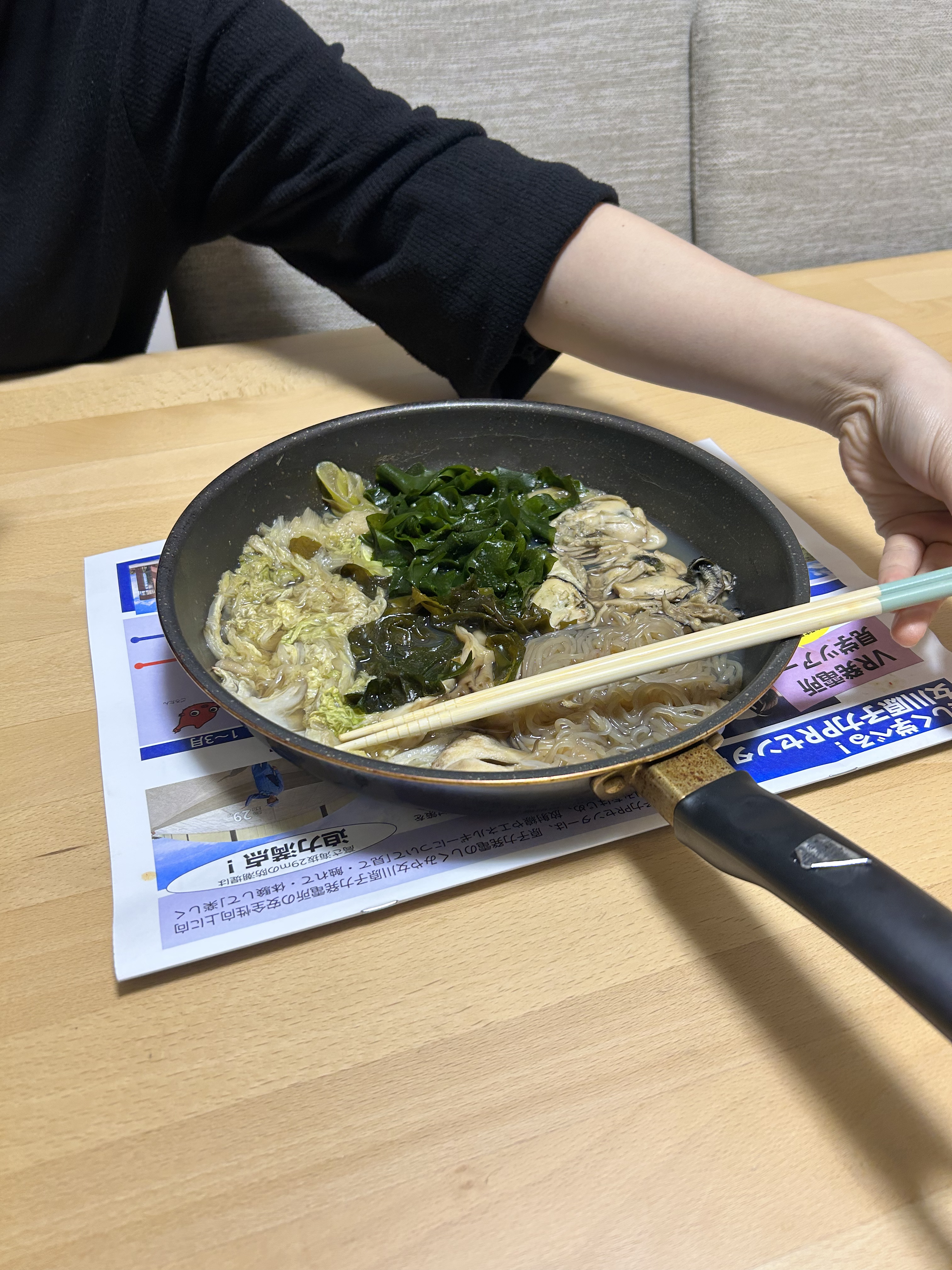 夜はシェアハウスのみらいちゃんとなおさんと、鍋パーティーをしました。なおさんの友達の漁師さんがまた別の友達の漁師さんからもらった(?)ワカメと牡蠣も使って、激うまお鍋でした😭