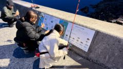 釣り道具のセットアップについて説明を一通り受けたあと、釣り場へ向かいます。釣り場には説明の看板が。なんと、太田さんが女川町と協力して作ったもののようです。