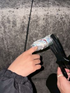 そこからは本格的に釣りタイムスタートです!色とりどりのワーム(ゴムの棒状の餌食)をつけて、海へ投げ入れます。釣り糸がしゃらしゃらしゃら〜と音を立てながら伸びていくのが楽しくて楽しくて。メバルはあまり動かないようなので、何度も何度も、別の場所を狙って投げ入れます。お恥ずかしながら私は開始2時間くらいまでまともに投げることすらできませんでした…